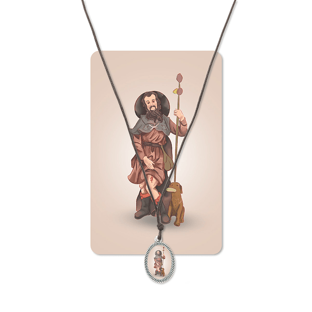 Collier catholique de Saint Roch réglable à votre guise, comprenant une carte avec prière dans la langue sélectionnée.